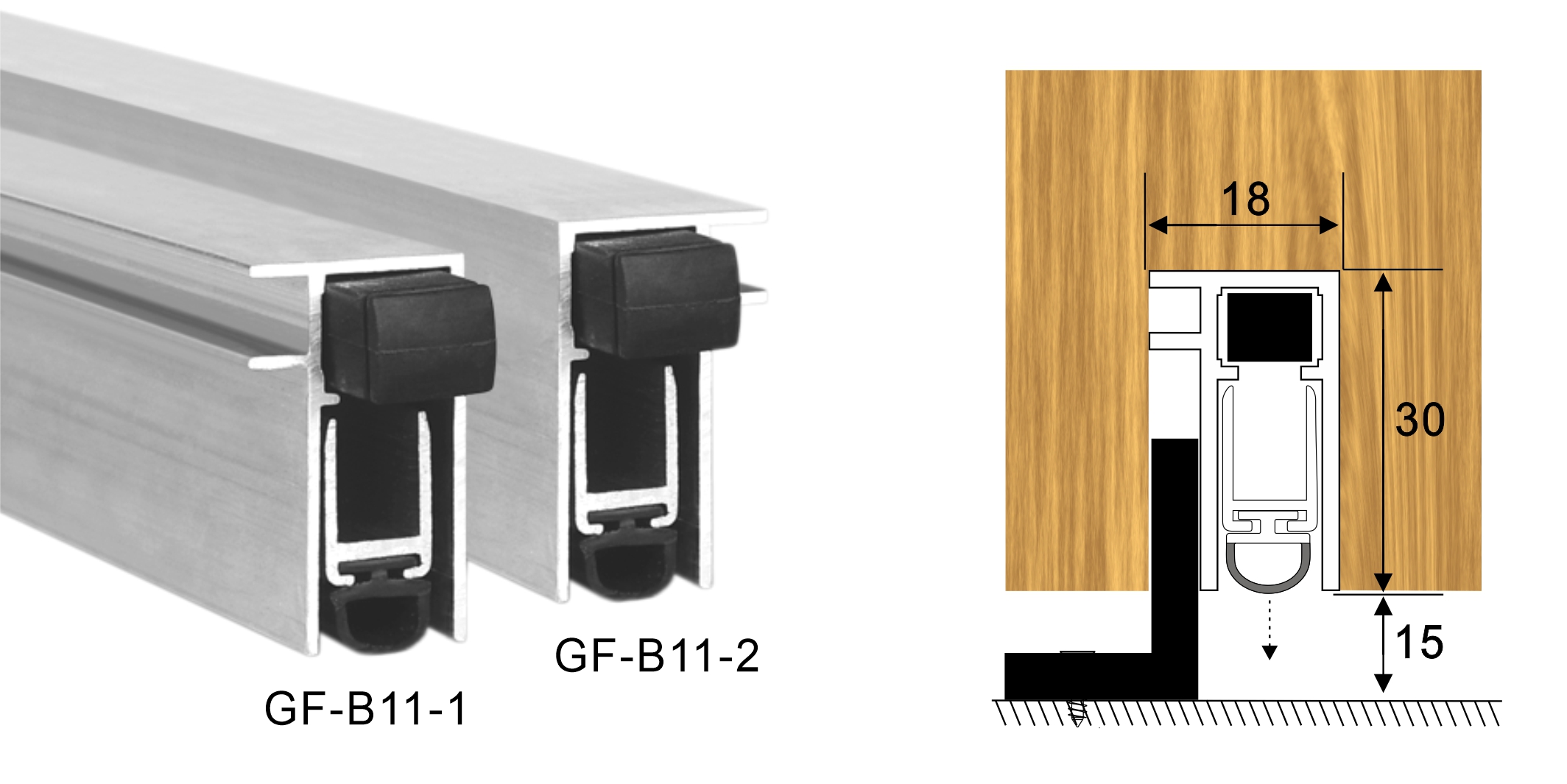 GF-B11 is specially designed for the bottom of sliding door. When the door sliding to close, the button press the door frame , strip drop down automaticly to seal the gap of the door bottom.